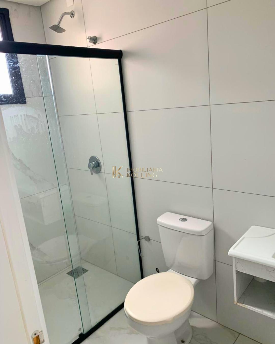 - Banheiro com box de vidro e armários